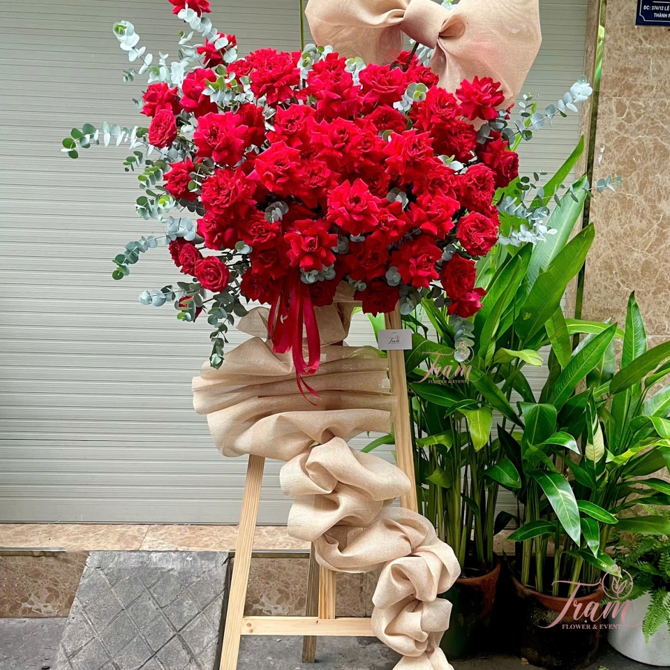 Kệ hoa chúc mừng với sắc đỏ chủ đạo tượng trưng cho may mắn, thịnh vượng và sự khởi đầu tốt đẹp. Những đóa hoa đỏ rực rỡ được điểm xuyết bằng lá xanh tươi mát, mang đến cảm giác tràn đầy năng lượng và niềm tin. Kết hợp cùng phần trang trí vải bố mềm mại, kệ hoa vừa giữ được nét tinh tế vừa tạo nên ấn tượng mạnh mẽ, trang trọng. Đây là lựa chọn lý tưởng để gửi gắm lời chúc hồng phát, chúc mừng sự kiện trọng đại, khai trương hay kỷ niệm thành công.