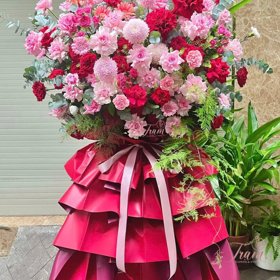 Chân kệ xếp tầng màu đỏ đậm kết hợp nơ lụa: Thể hiện sự sang trọng, bề thế và nổi bật không gian khai trương.