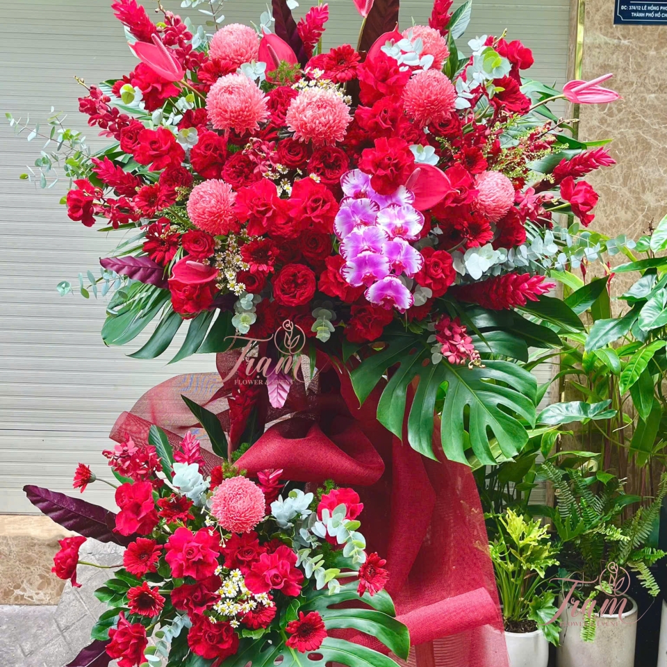 Sắc đỏ rực rỡ gửi gắm lời chúc công việc hanh thông, sự kiện diễn ra tốt đẹp và tương lai ngày càng thịnh vượng. Thiết kế trang trọng giúp kệ hoa trở thành điểm nhấn ấn tượng, thể hiện sự trân trọng và chúc mừng chân thành từ người gửi.