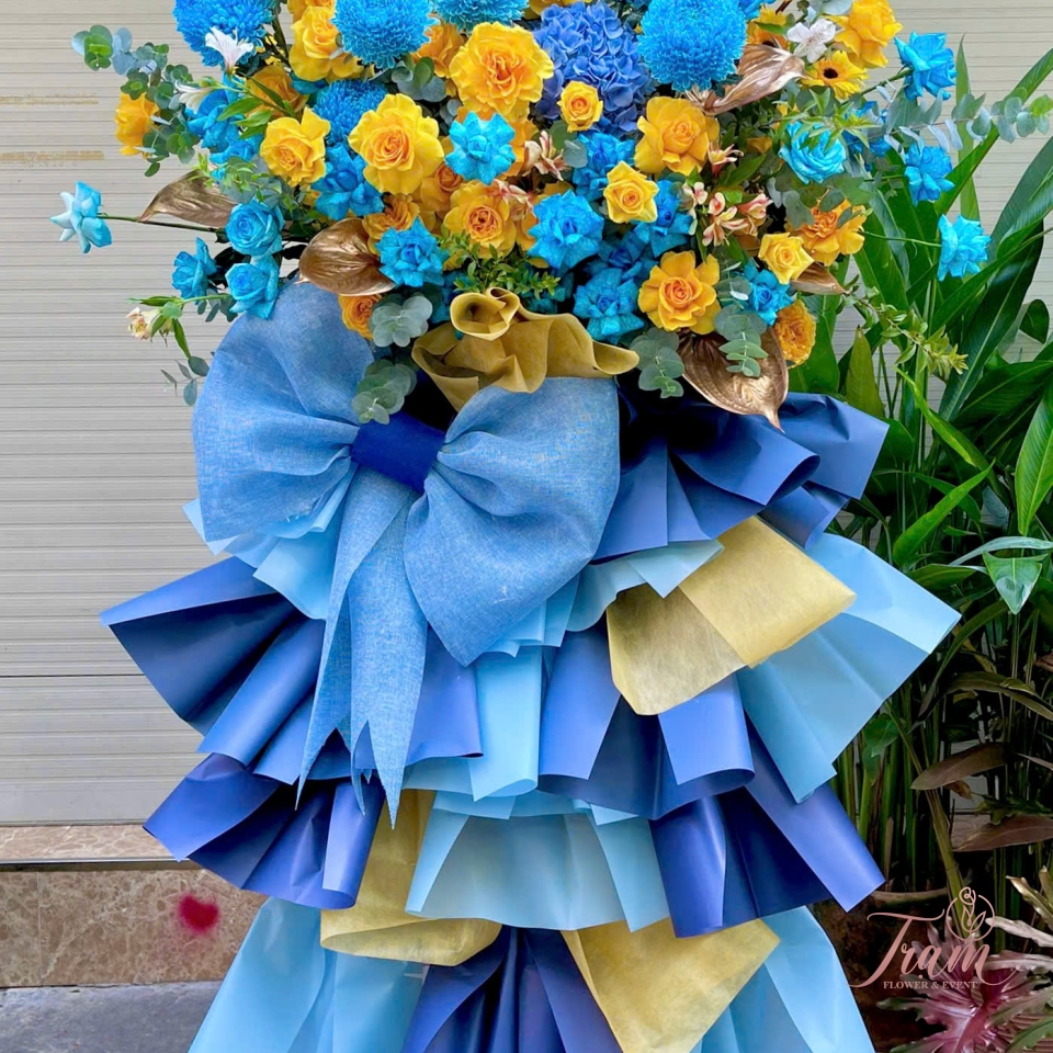 Kệ hoa tone xanh dương – vàng mang ý nghĩa niềm tin vững chắc – trí tuệ – thịnh vượng.