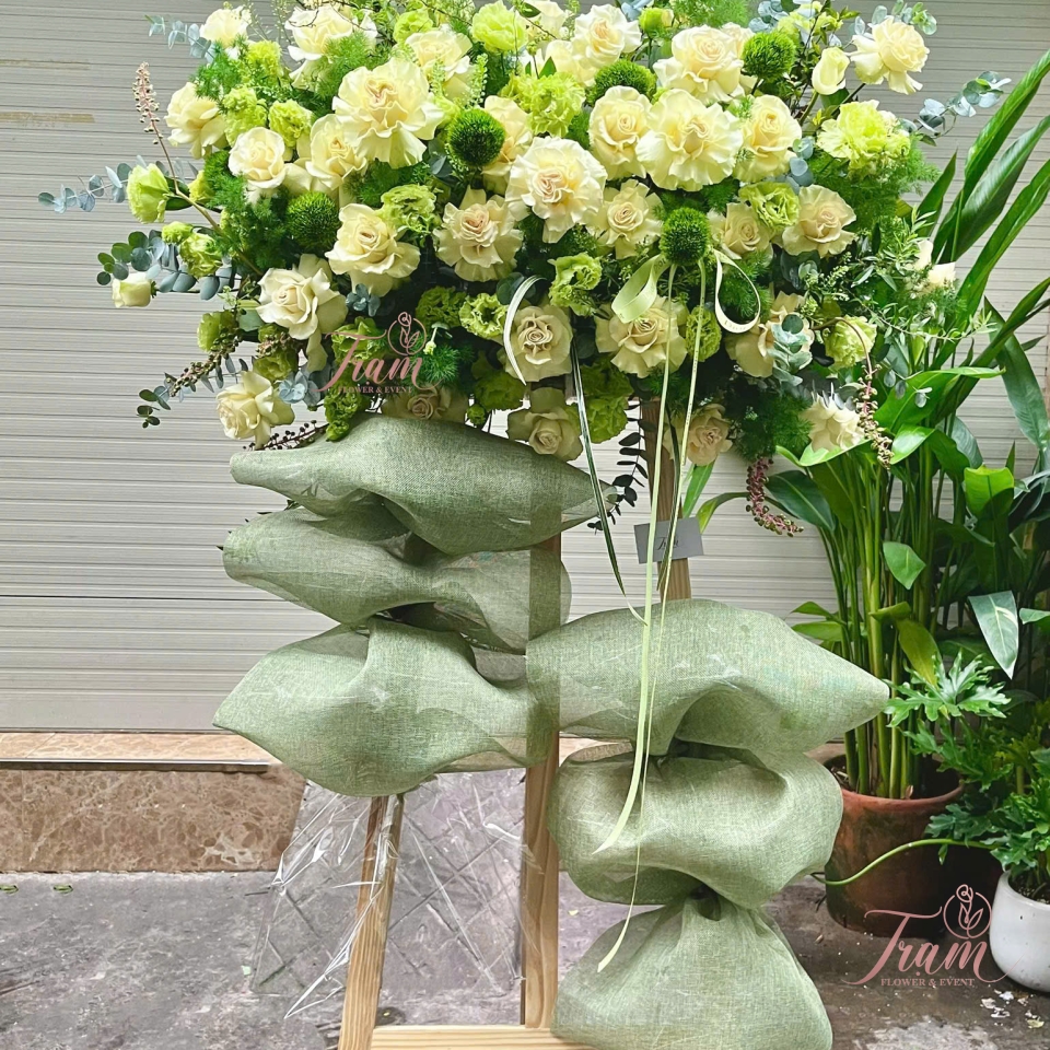 Kệ hoa tone xanh lá – kem tượng trưng cho sự sinh trưởng, khởi đầu tốt đẹp và phát triển bền vững. Sắc xanh lá đại diện cho sức sống, niềm tin và hy vọng; sắc kem thể hiện sự tinh tế, trang nhã và hài hòa.